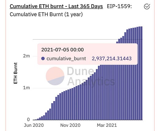 Още по bullish обаче е становището на потребител в Twitter, според когото ако EIP-1559 беше влязъл в сила преди година, това щеше да намали предлагането на Етър с 3М, което е около $6В.